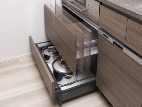 重量物を入れた時でもスムーズな引き心地を実現。引出しを強く押しても途中でスピードが落ち、静かに閉まります。